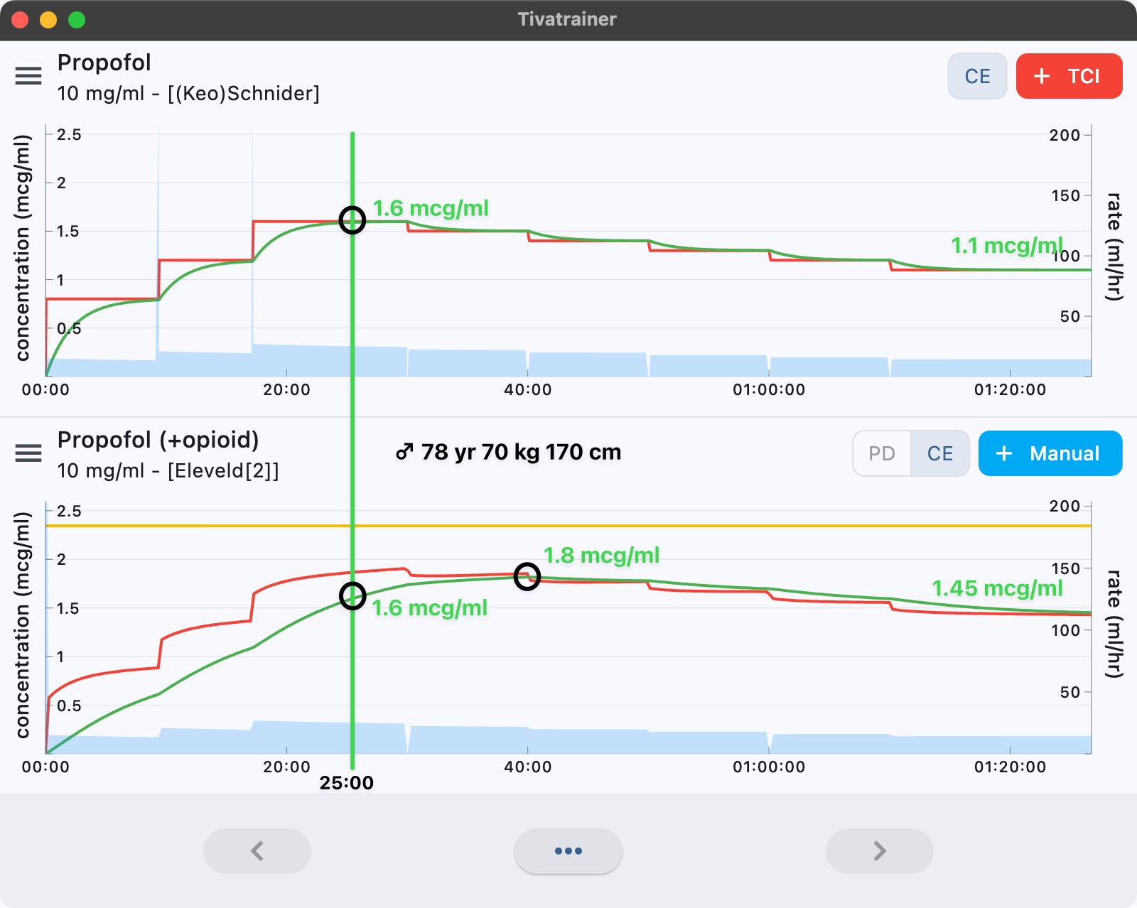 Using the copy-paste function in Tivatrainer, the drug delivery profile from the Schnider simulation in TCI can be applied to the Eleveld (+opioid) model in manual mode so the infusion changes in the Schnider model are recalculated into concentrations in the Eleveld model. (fig 2)