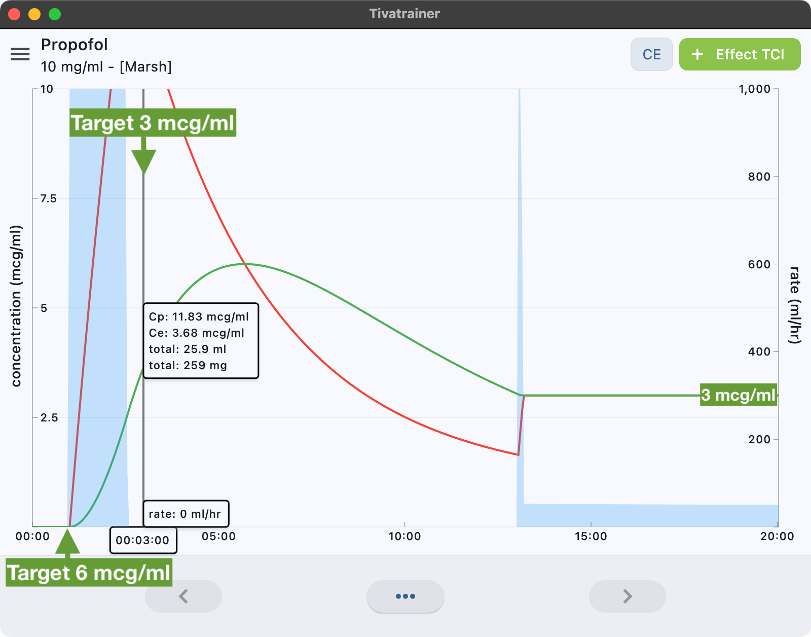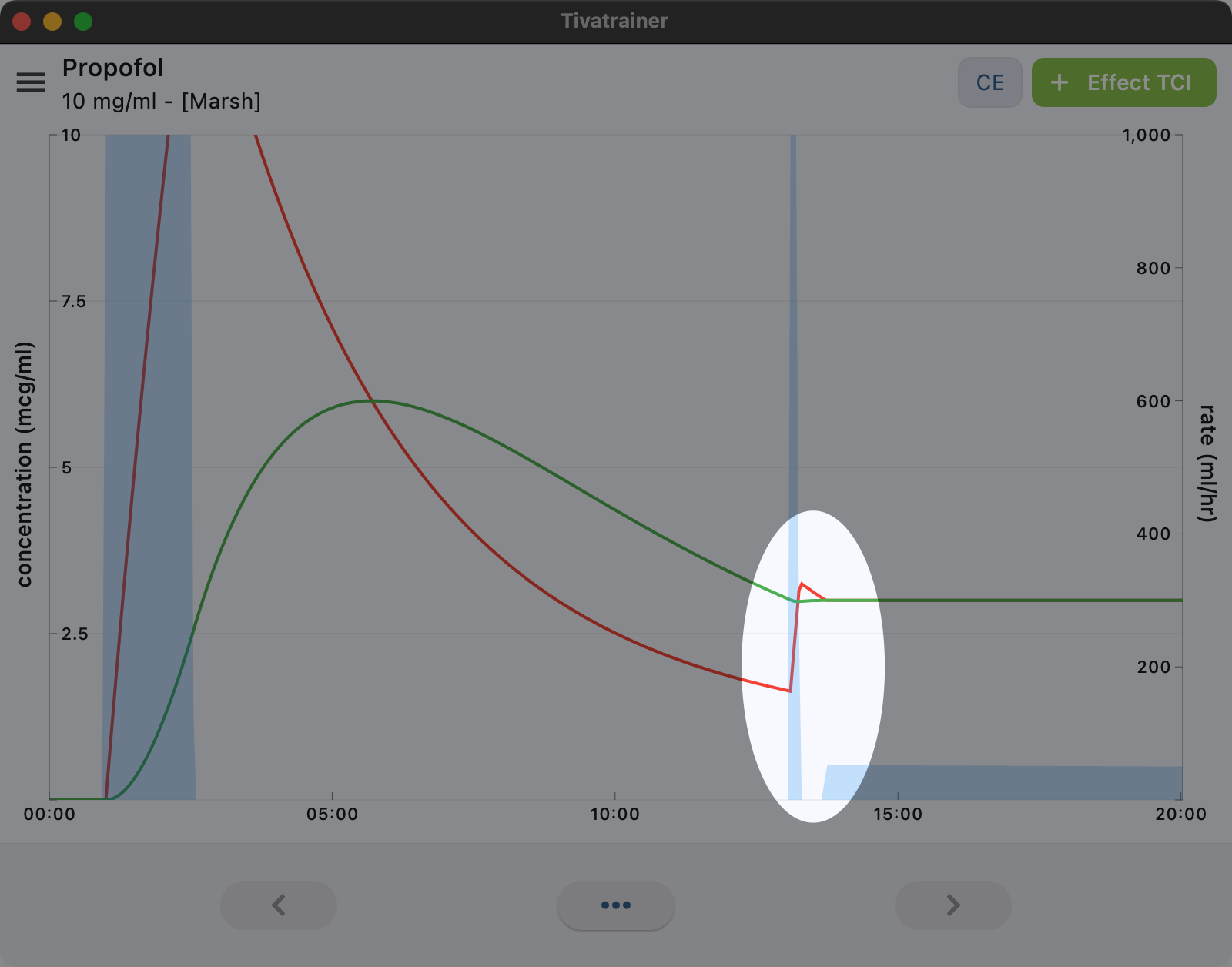 The Target Controlled Infusion (TCI) simulations in Tivatrainer are built upon a sequence of targets entered by the user. Decreasing a target before it is established is not a problem in plasma (blood) control, but in effect-site control the previous target may cause an overshoot in the effect-site concentration that cannot be undone. The “old” Tivatrainer (and TivatrainerX ) would enter an endless loop because of this contradictory situation: the plasma concentration decreases while the effect-site concentration continues to increase. In Tivatrainer version 3.1.0 (and later), this issue has now been resolved.